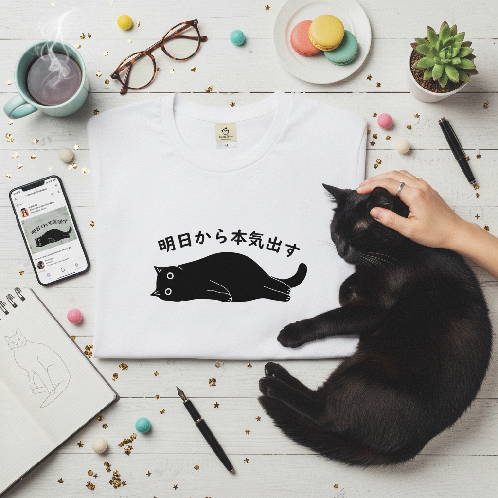 猫Tシャツ「明日から本気出す」|おもしろ&かわいい猫イラスト|アダルト/キッズ対応|SNSで話題!思わず笑顔に♪