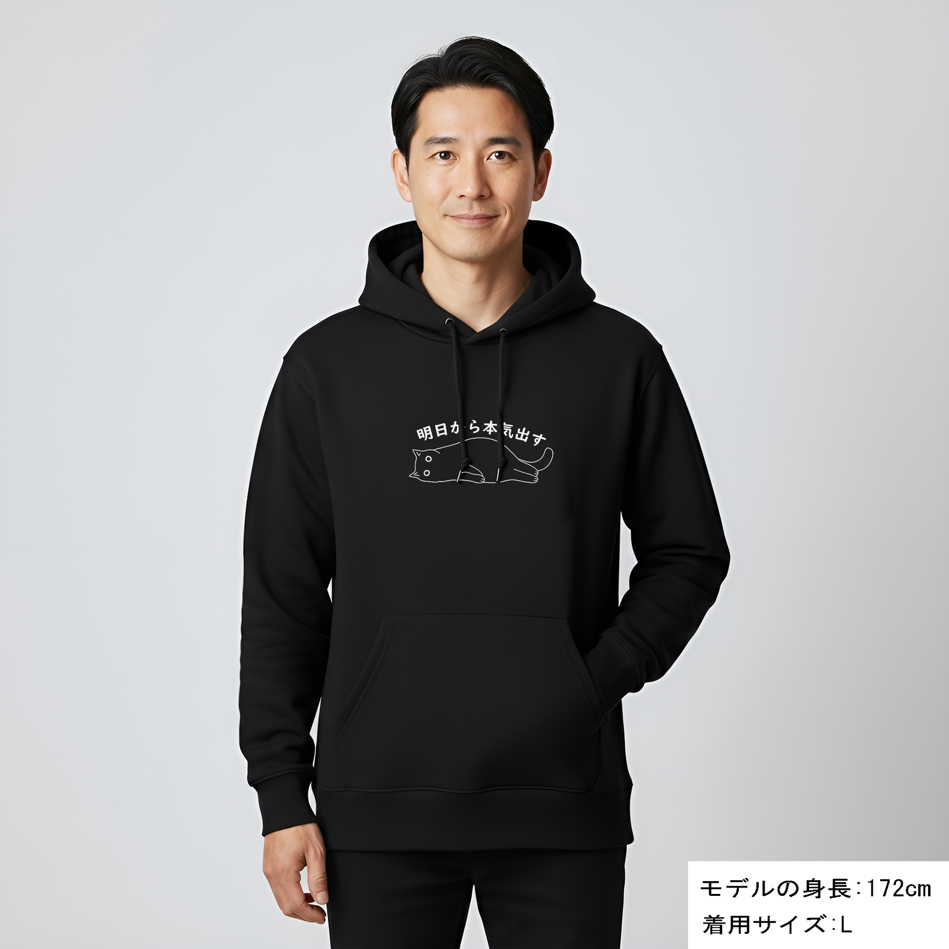 猫Tシャツ「明日から本気出す」|おもしろ&かわいい猫イラスト|アダルト/キッズ対応|SNSで話題!思わず笑顔に♪