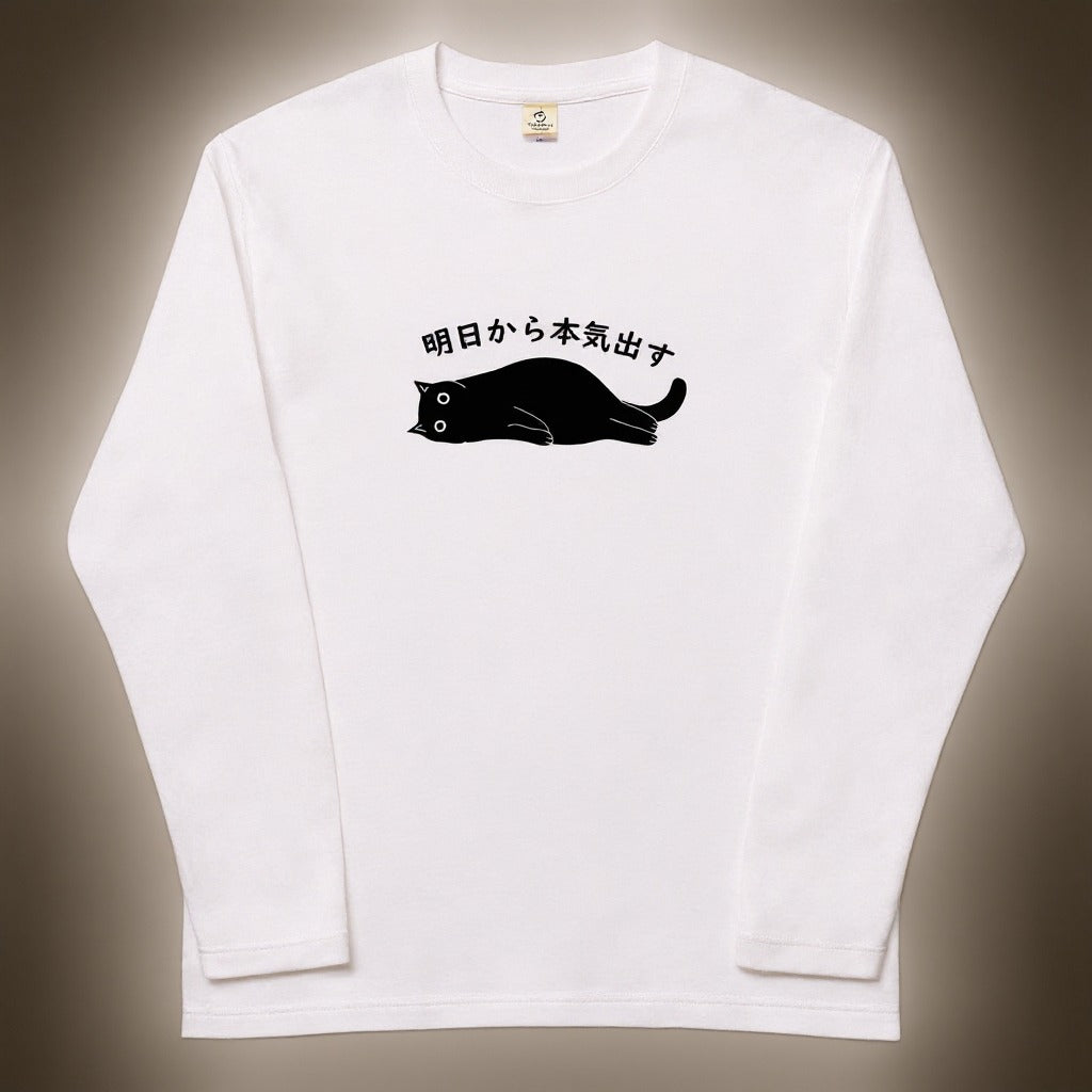 猫Tシャツ「明日から本気出す」|おもしろ&かわいい猫イラスト|アダルト/キッズ対応|SNSで話題!思わず笑顔に♪