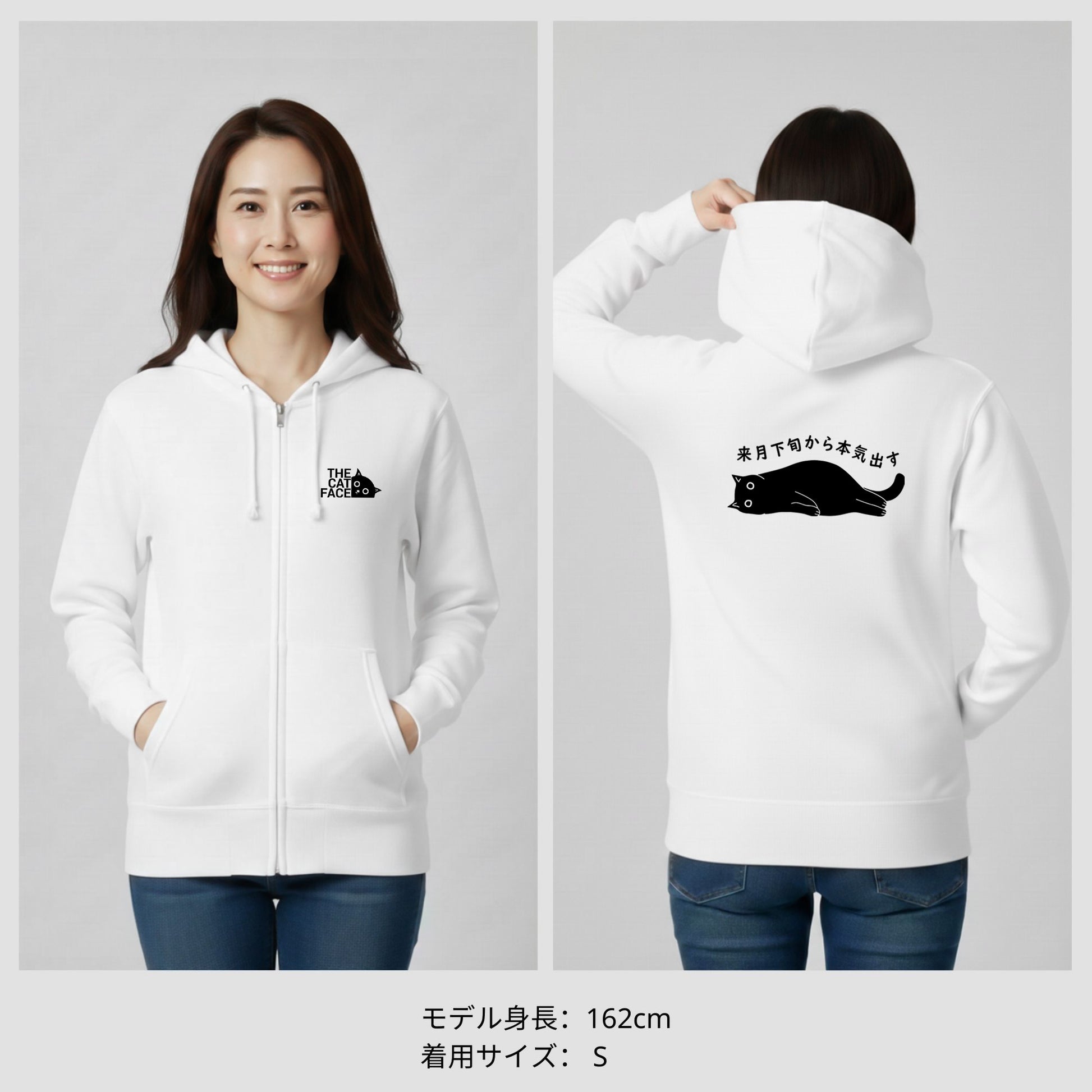 猫 フルジップ パーカ ねこ かわいい 猫イラスト The Cat Face & 来月下旬から本気出す |フロント&バックプリント